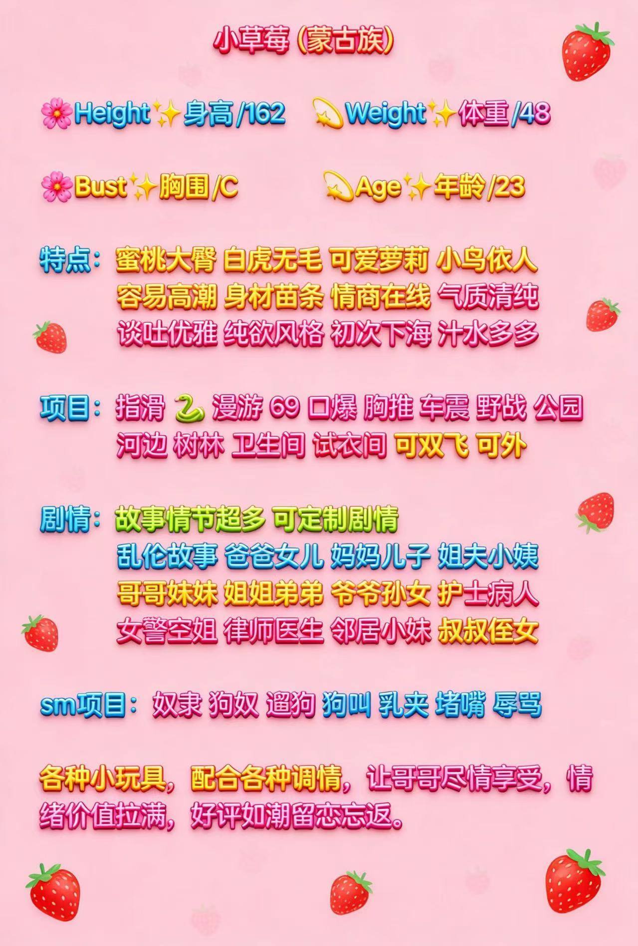 娇羞可爱的小萝莉;清纯漂亮,颜值高的女学生;温婉体贴、成熟妩媚的女秘书;身材高挑、腰细胸挺、漂亮性感的女模特;各式女神,任您挑。各式情景房(教室、护士房、新婚房、“户外房”等)一应俱全。角色扮演、引诱、QJ,各式场景应有尽有!!!KJ、RJ、肛交、无套ML,AV中有的,您想体验的,这里都能满足!!!